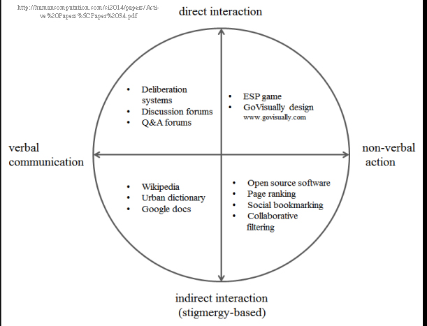 Finalmente, TARANEH KHAZAEI y LU XIAO (University of Western Ontario) introducen en Collective intelligence in Massive Online Dialogues un gráfico que ayuda a entender de qué manera las cibercomunidades contribuyen a la estigmergia incluso donde se da interacción virtual sin confrontación visual (Inteligencia colectiva online: ¿es posible?):