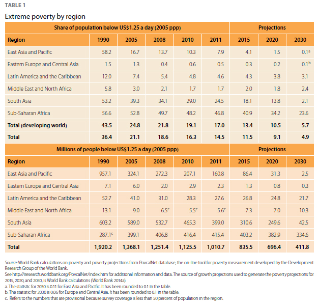 The report notes that much success has been achieved in reducing extreme poverty – those living on less than a $1.25 a day. However, the number of poor remains unacceptably high, at just over 1 billion people (14 percent of the world population) in 2011, compared with 1.2 billion (19 percent of the world population) in 2008.